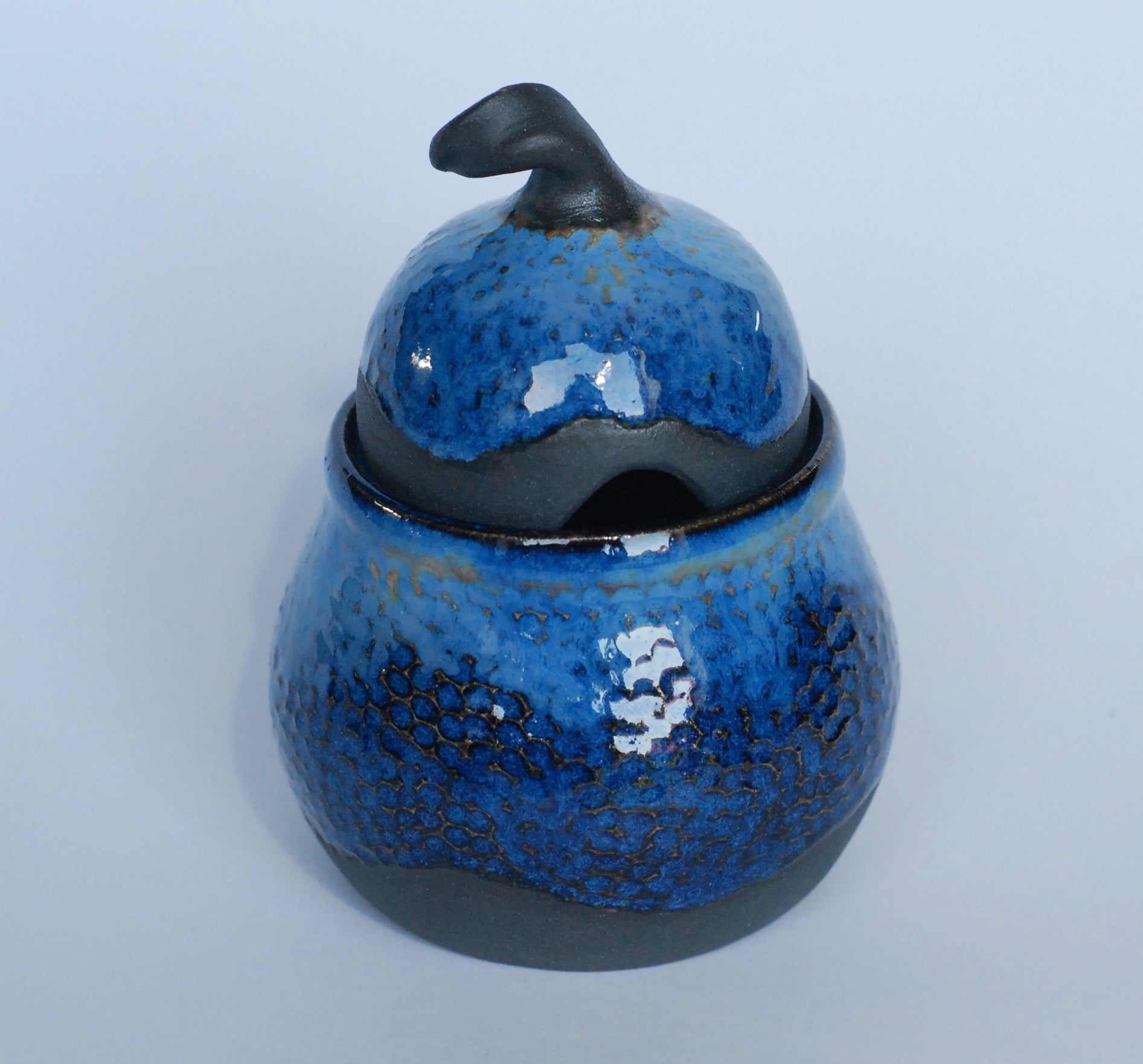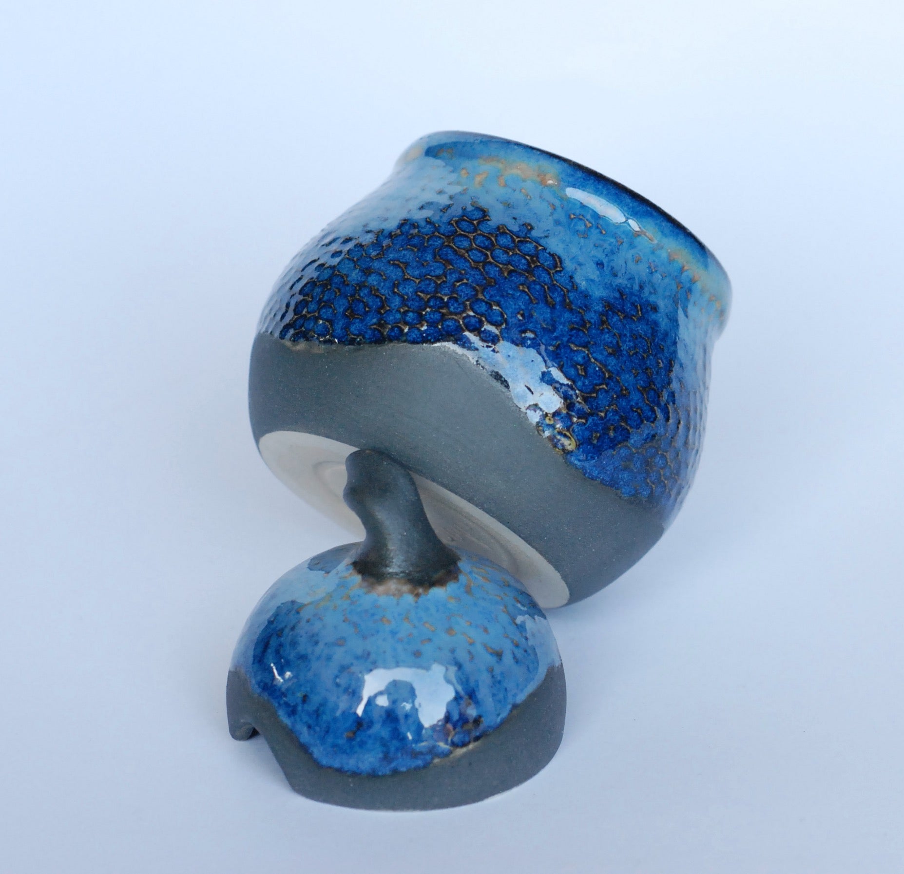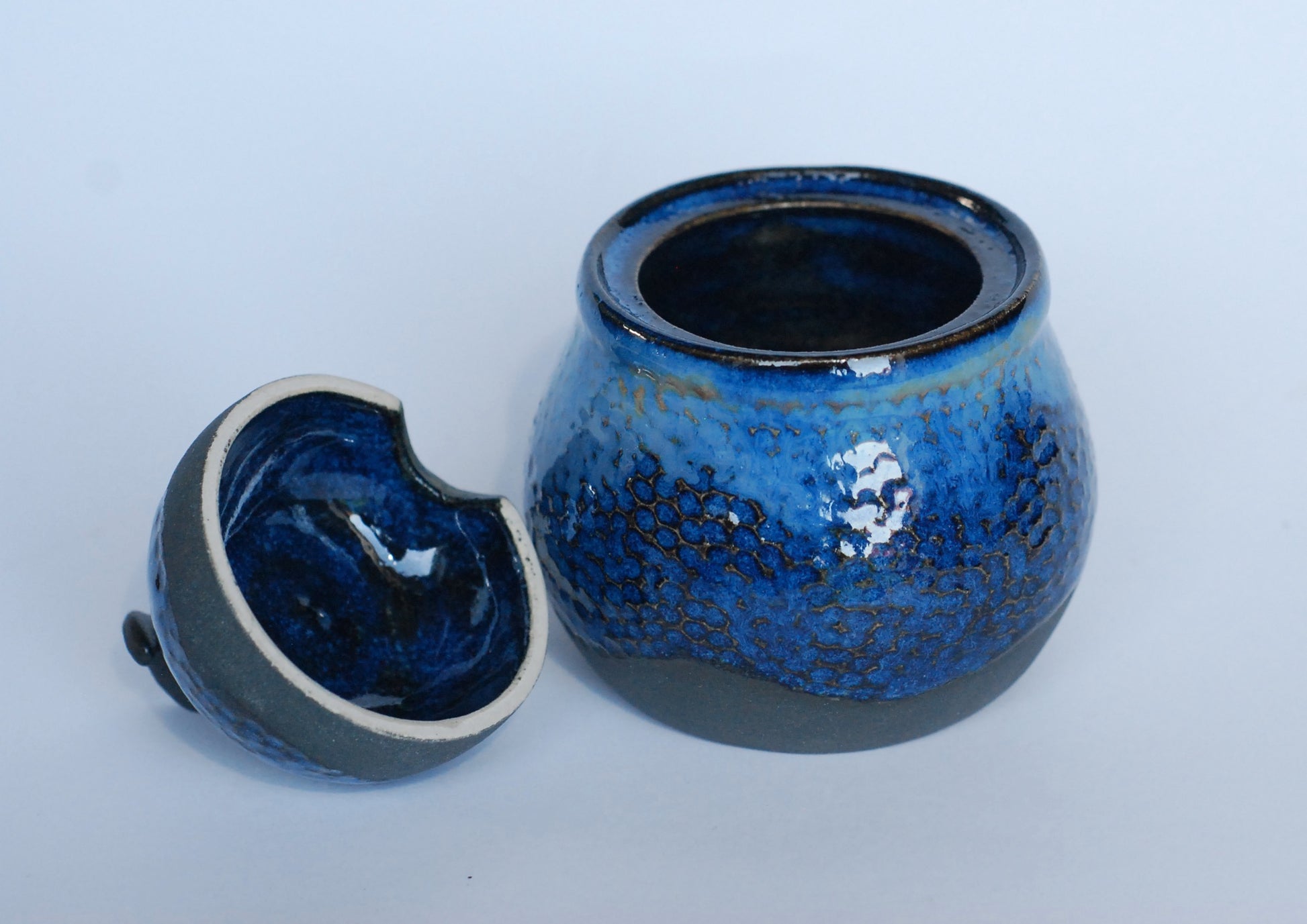 Cukiernica wytoczona na kole, składa się z dwóch elementów. Jak często w moich wyrobach ona również ma strukturę, a gliniany czerep pokryty jest błyszczącym szkliwem w kontraście do czarnej, matowej angoby. Zastosowana glina, szkliwo i procedury wypału w temperaturze 1250 zapewniają bezpieczne używanie. Można myć w zmywarce.