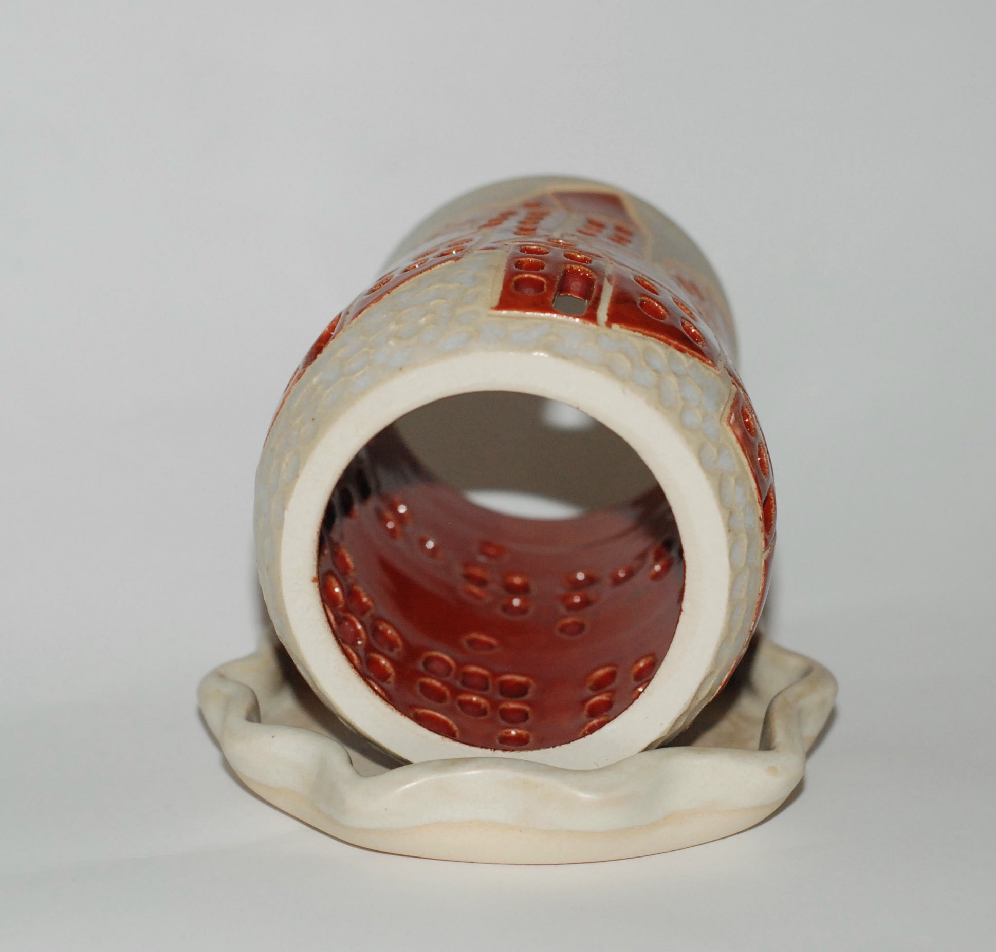 Kominek z jasnej gliny, składający się z dwóch elementów. Wycinany w charakterystyczny wzór domków, który podkreślony płomieniem świecy daje ciekawe efekty wizualne. Toczony na kole :)