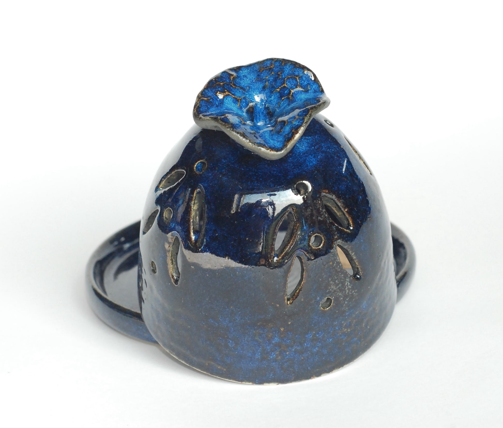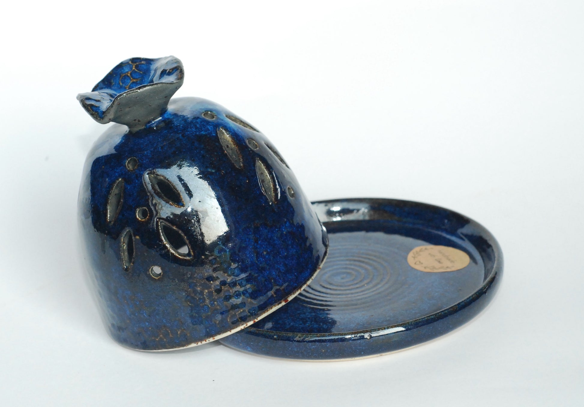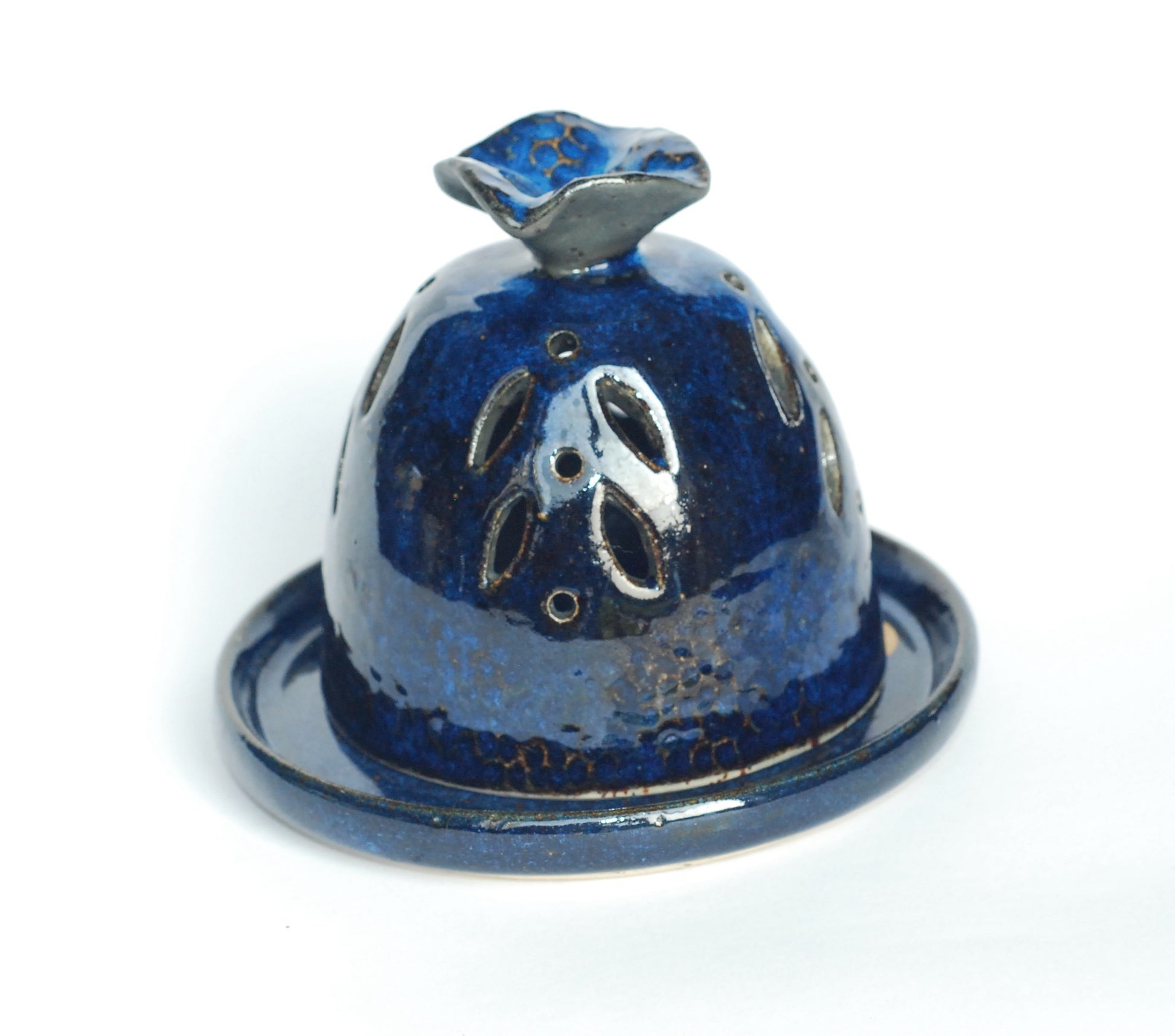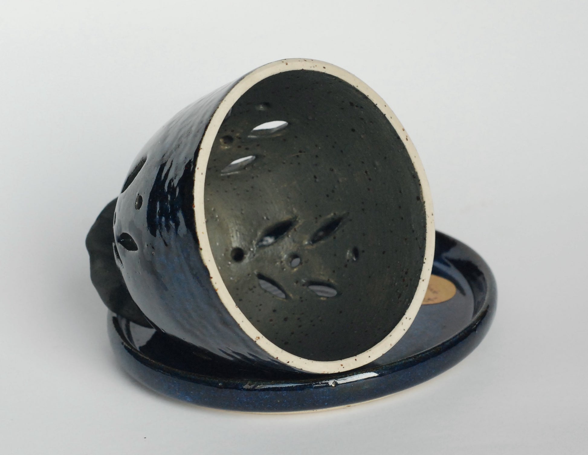 Kominek toczony na kole, wycinany, składa się z dwóch elementów, podstawka i pokrywki. Idealny do Palo santo, czy kadzideł stożkowych. Czerep jest z jasnej gliny w czarne kropki, ozdobiony błyszczącym szkliwem i czarną angobą.