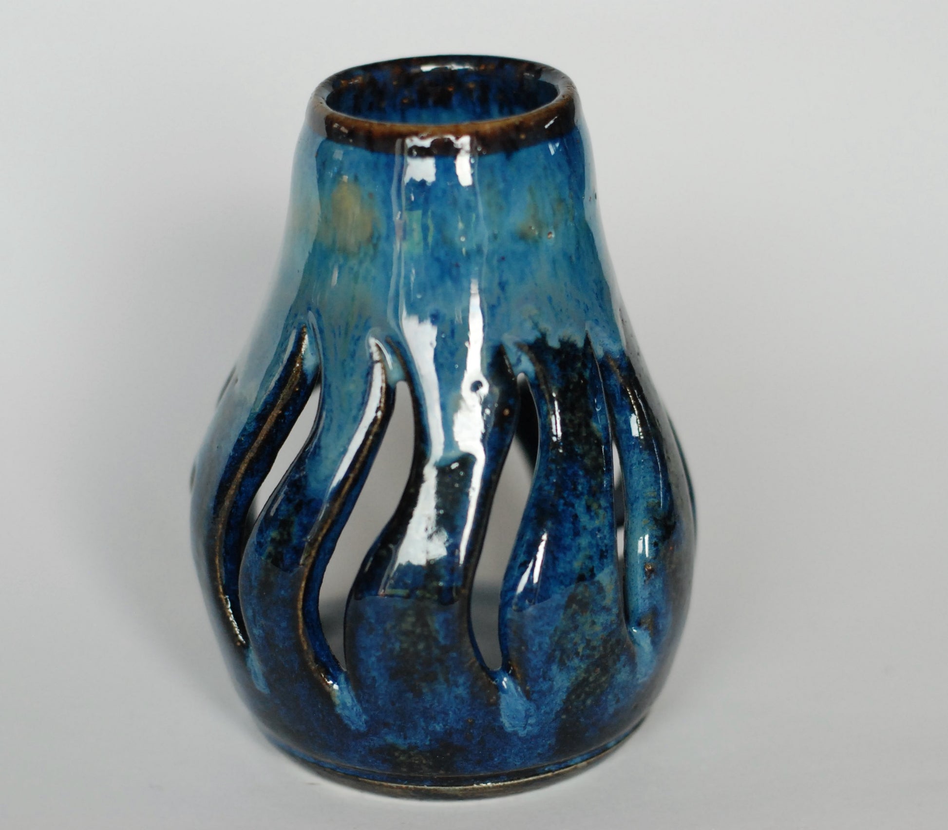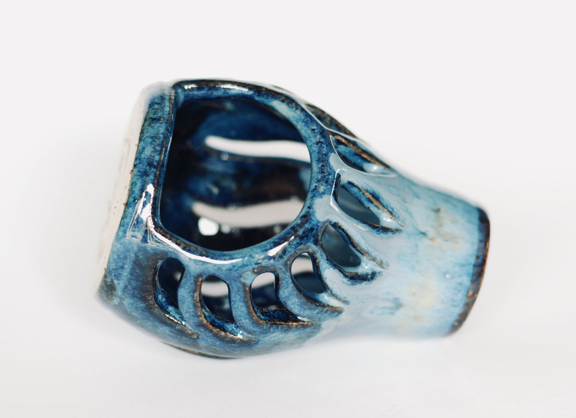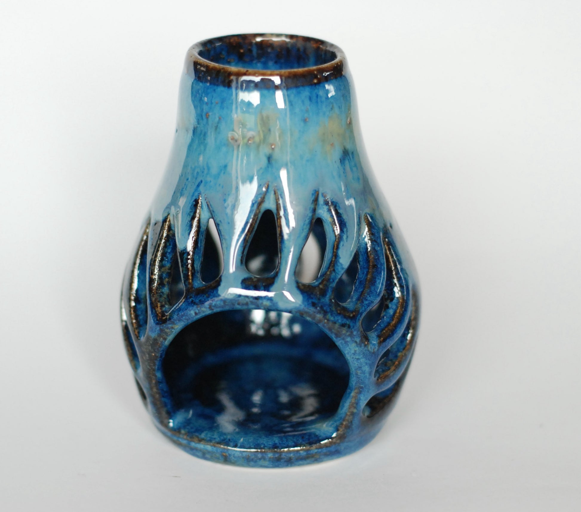 Kominek z jasnej gliny. Wycinany w ciekawy wzór , który podkreślony płomieniem świecy daje ciekawe efekty wizualne. Szkliwiony w rożnych odcieniach niebieskiego.