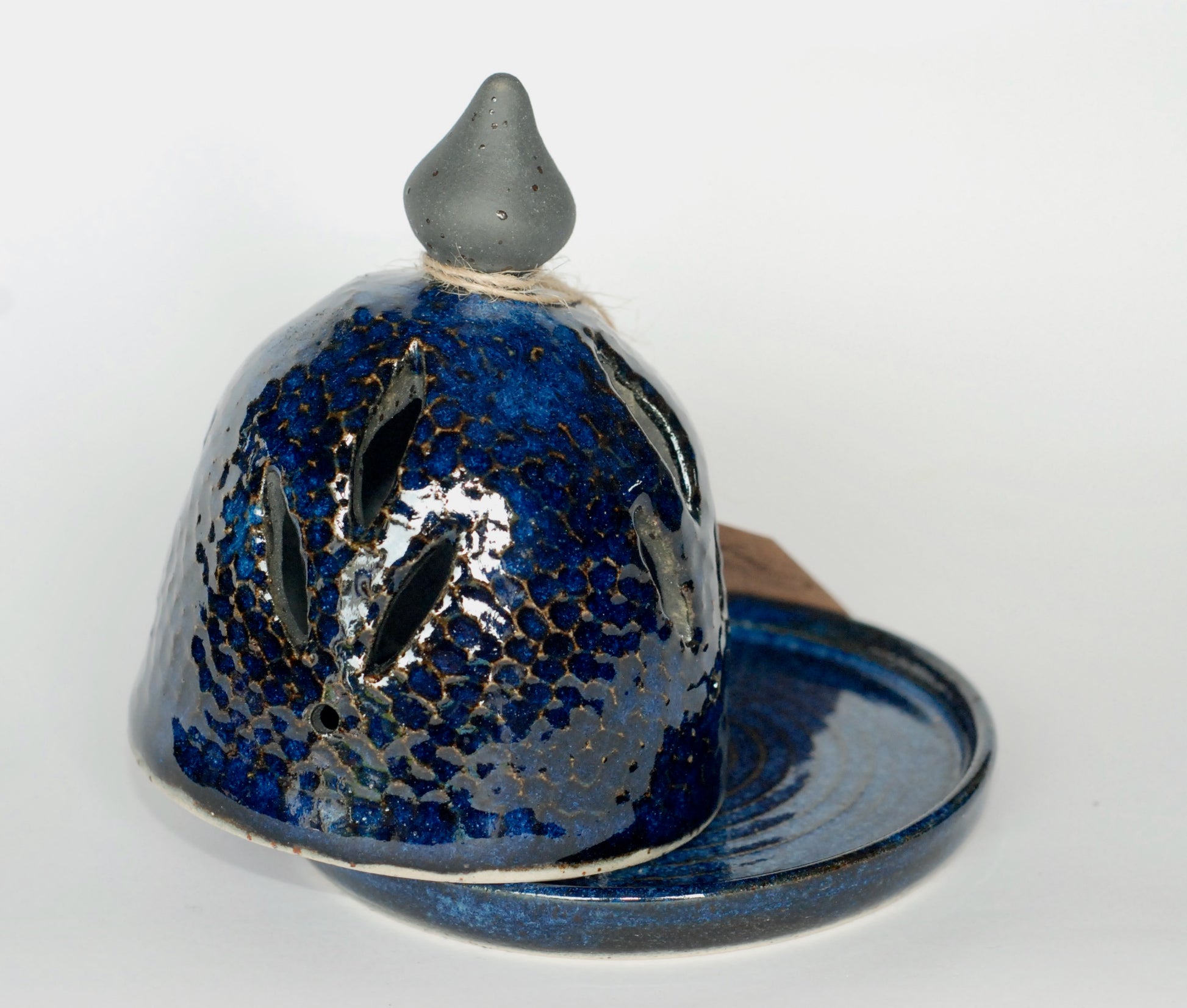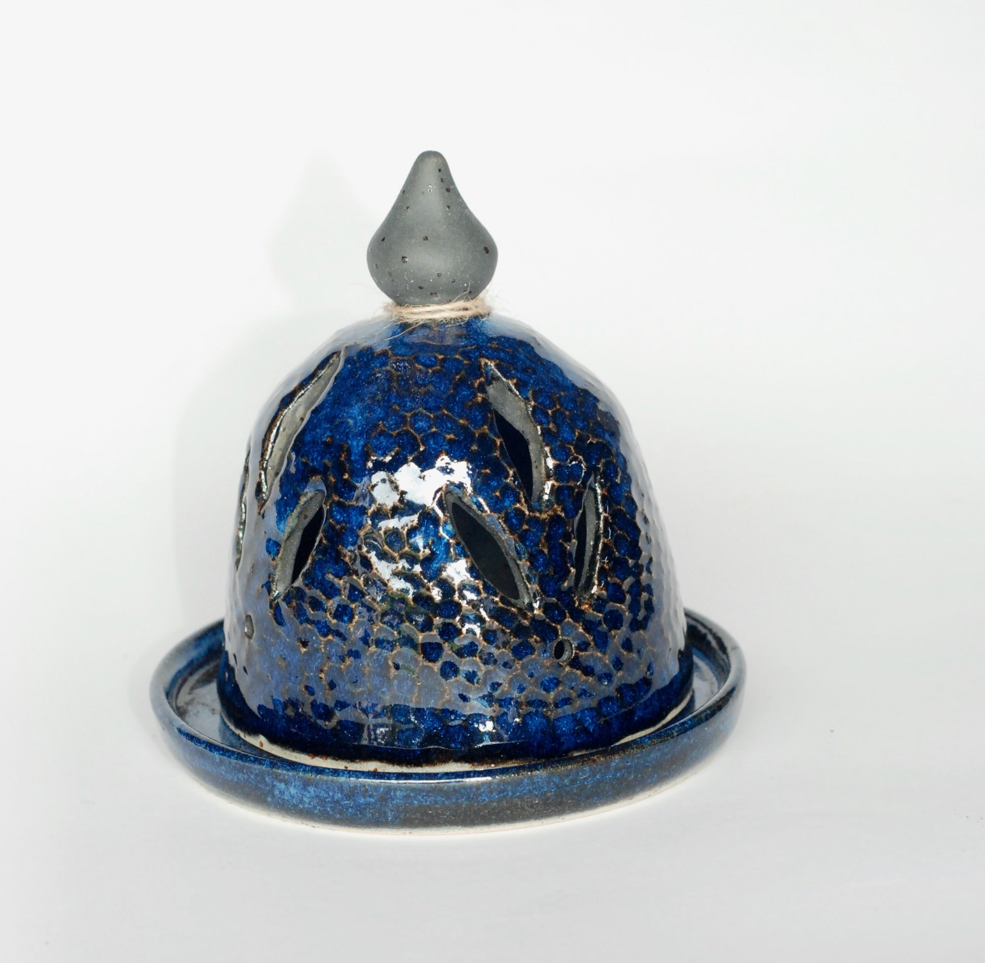 Kominek toczony na kole, wycinany, składa się z dwóch elementów, pokrywki i podstawka. Idealny do Palo santo, czy kadzideł stożkowych. Czerep jest z jasnej gliny w czarne kropki, ozdobiony błyszczącym szkliwem i czarną angobą.
