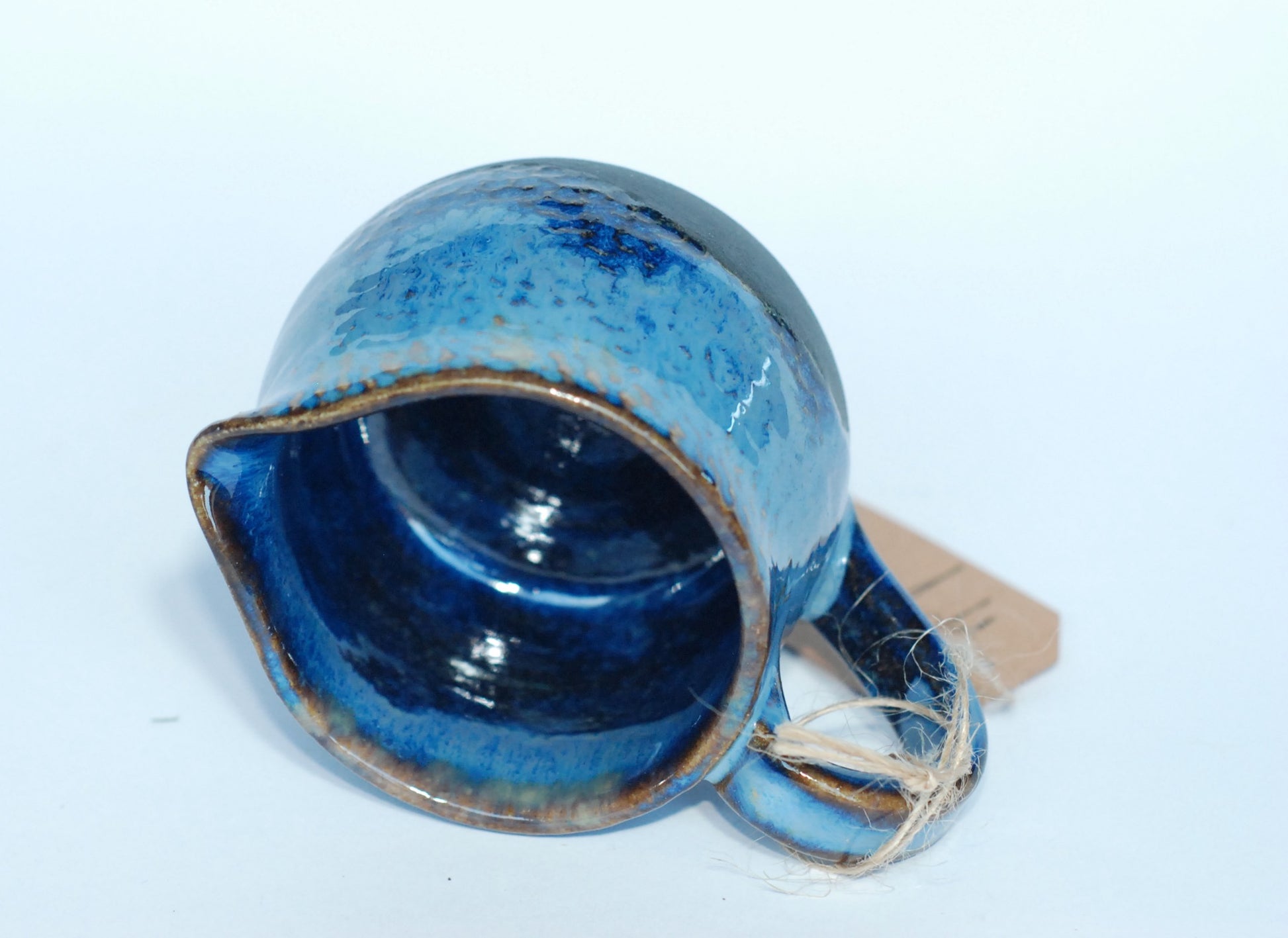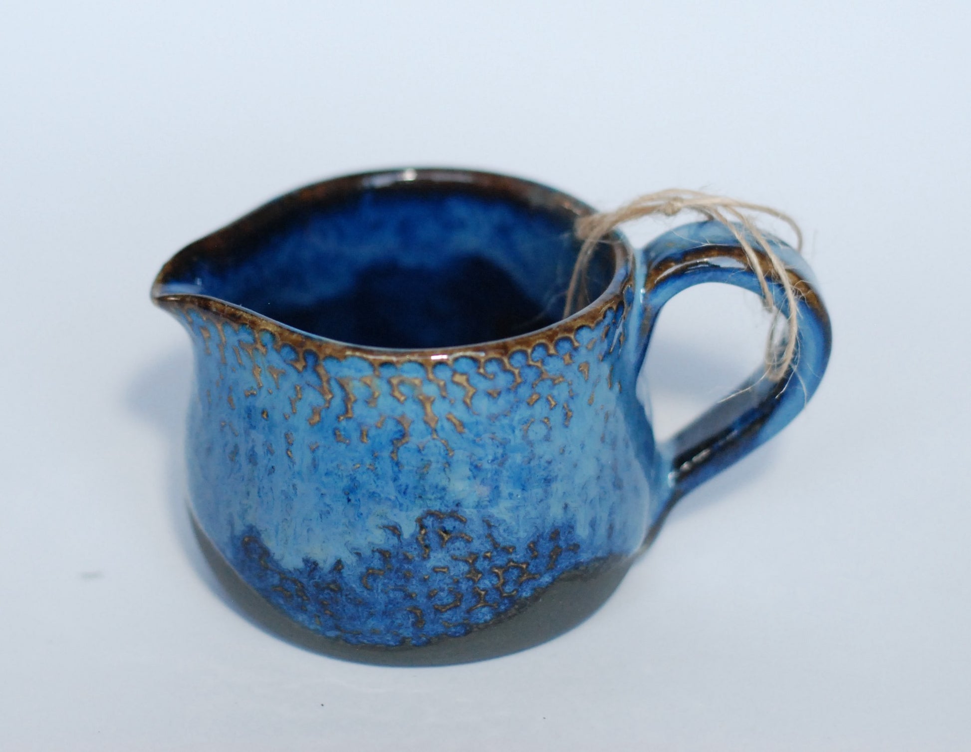 Mały mlecznik, wytoczony na kole. Czerep z jasnej gliny. Ozdobiony błyszczącym szkliwem z efektem i dla kontrastu matową, czarną angobą.