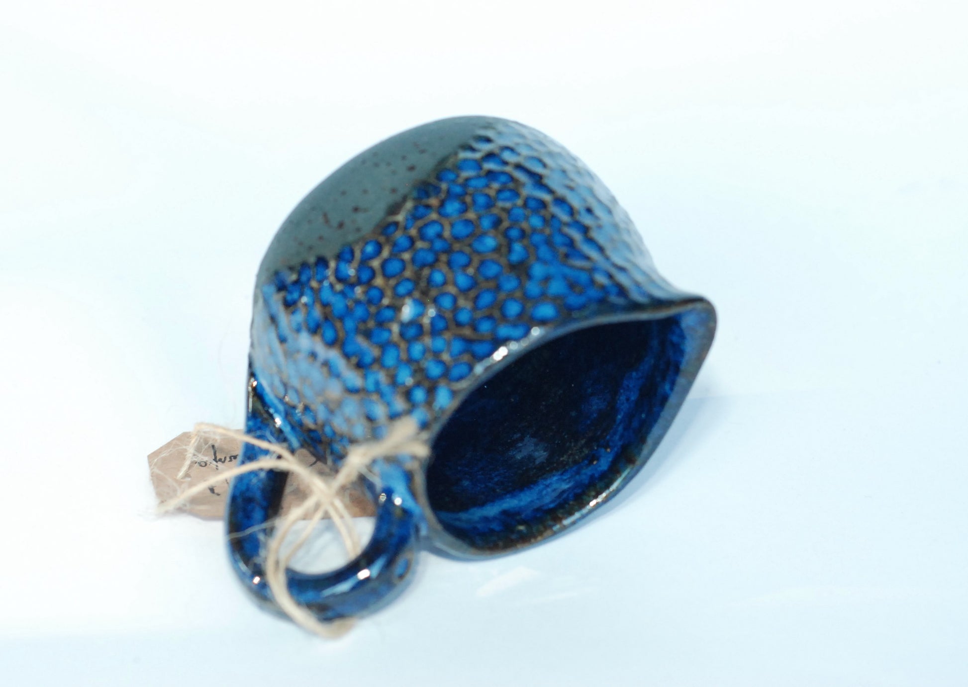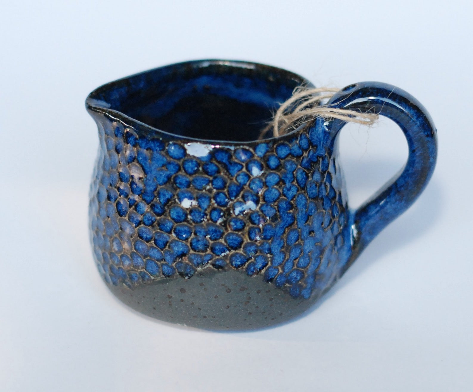 Mały mlecznik, wytoczony na kole. Czerep z jasnej gliny w czarne kropki. Ozdobiony błyszczącym szkliwem i dla kontrastu matową, czarną angobą.