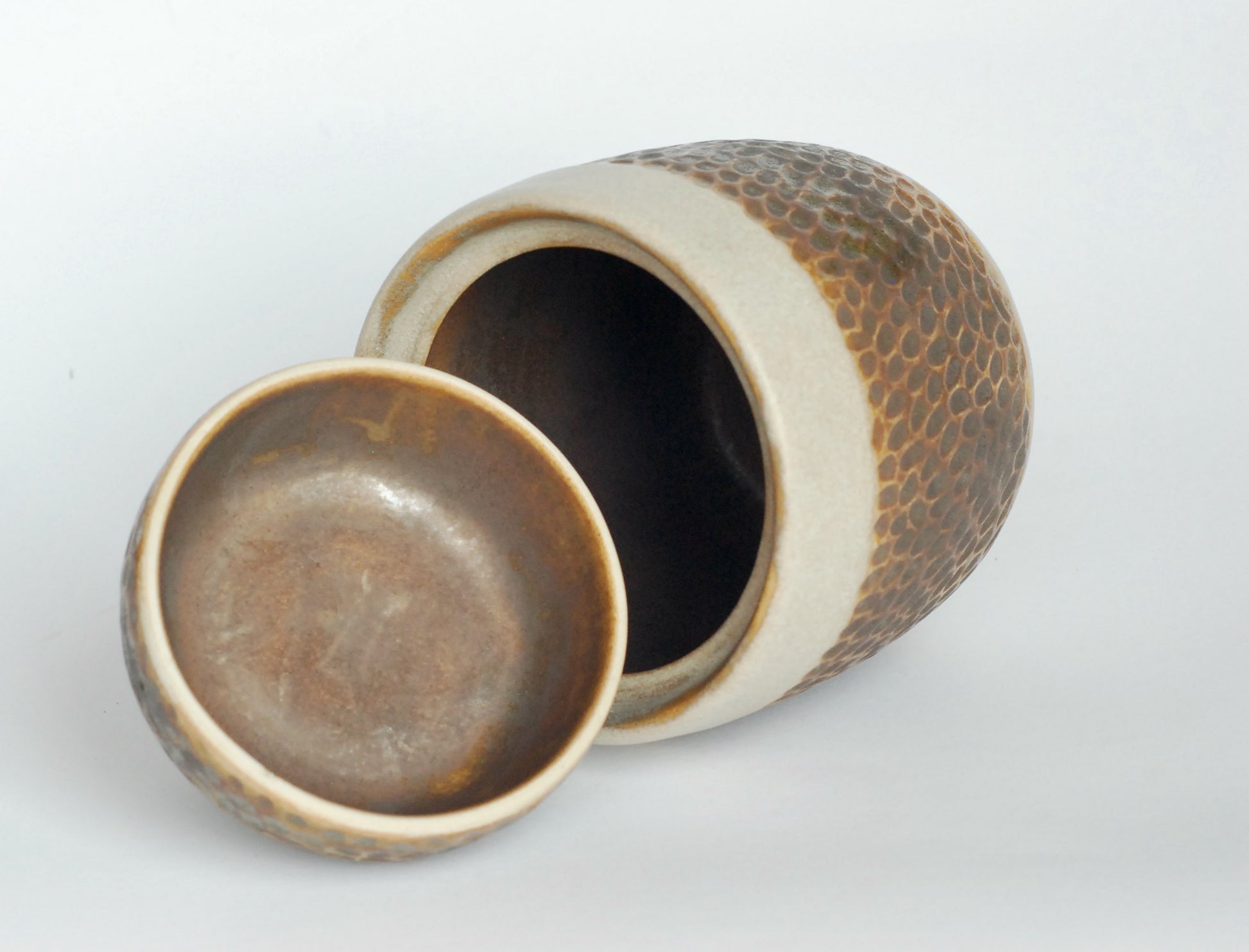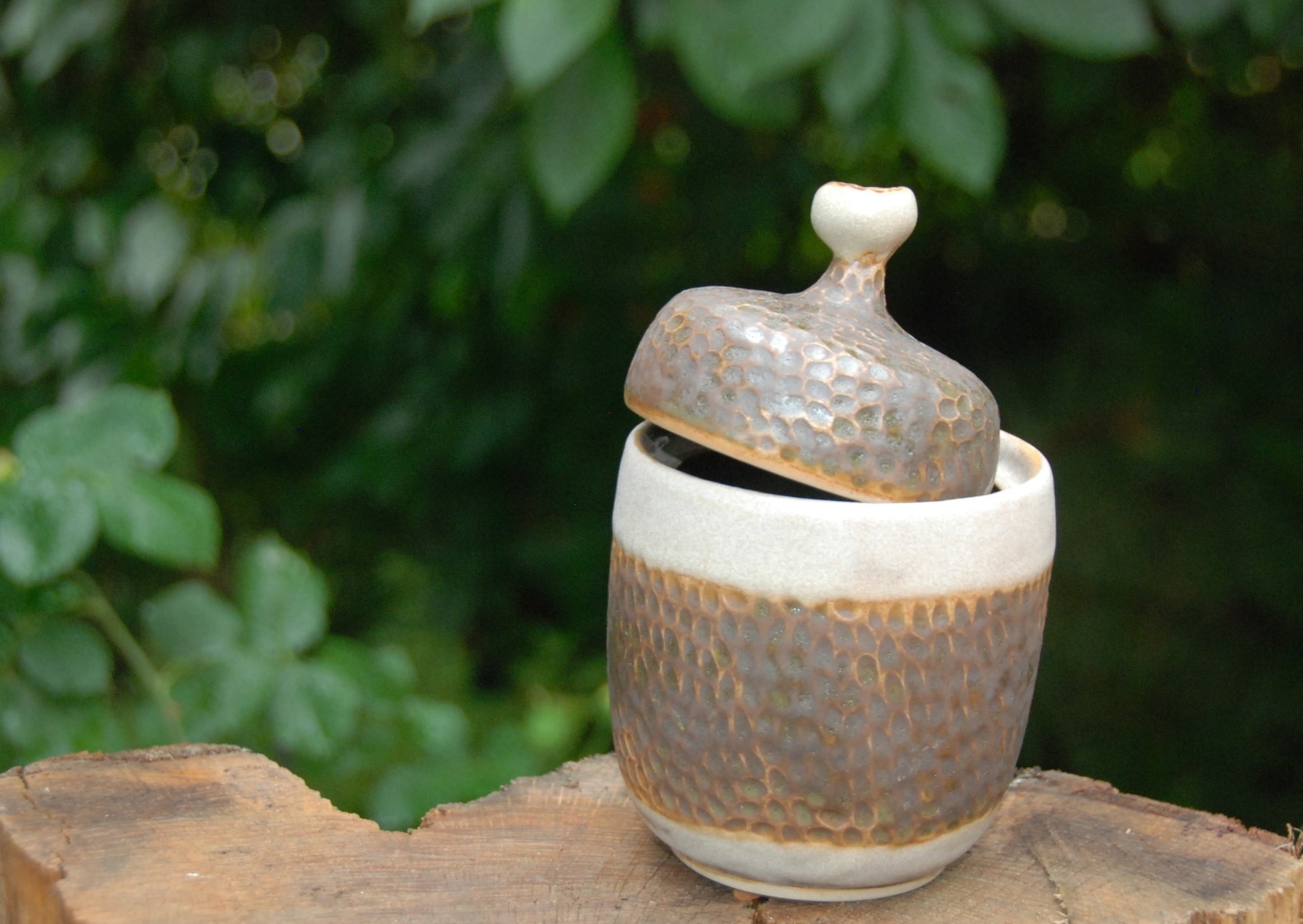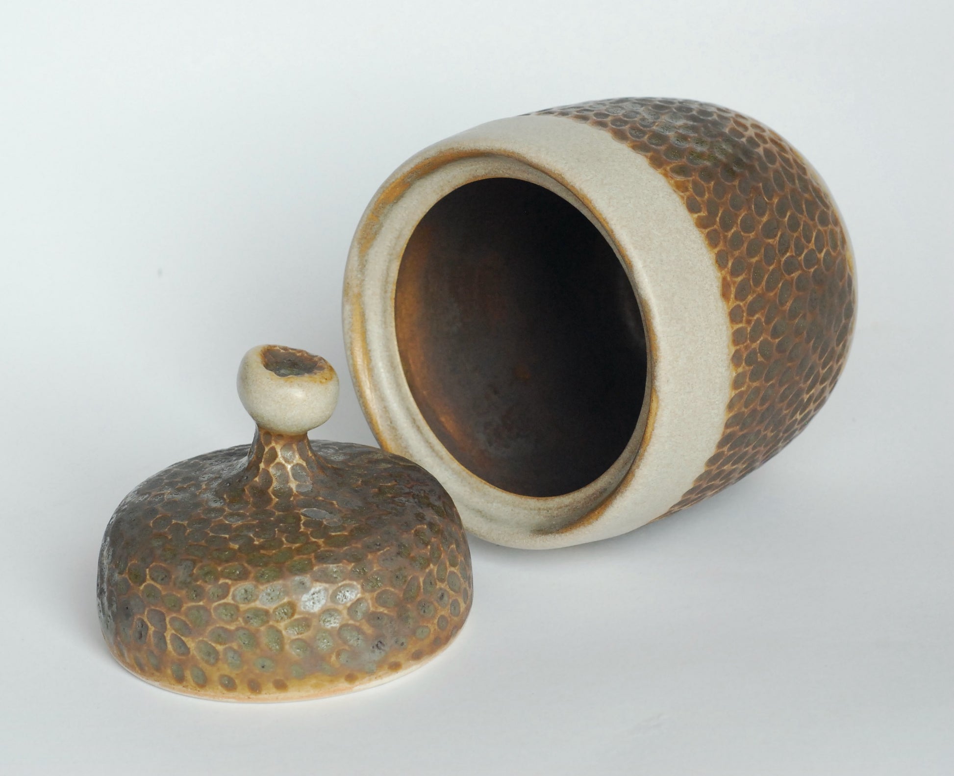 Pojemnik wytoczony na kole, składa się z dwóch części. Czerep ozdobiony matowymi szkliwami, aksamitny w wyglądzie i dotyku.