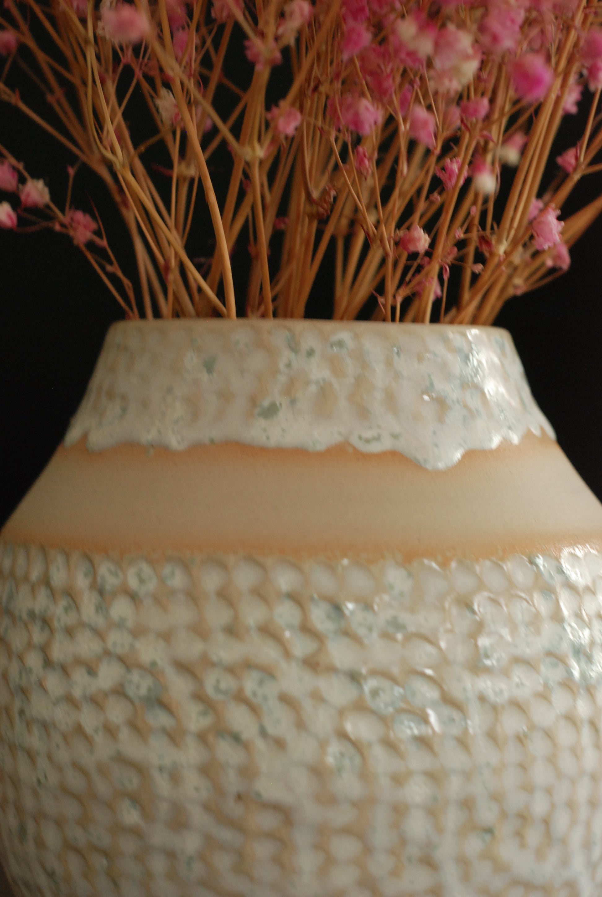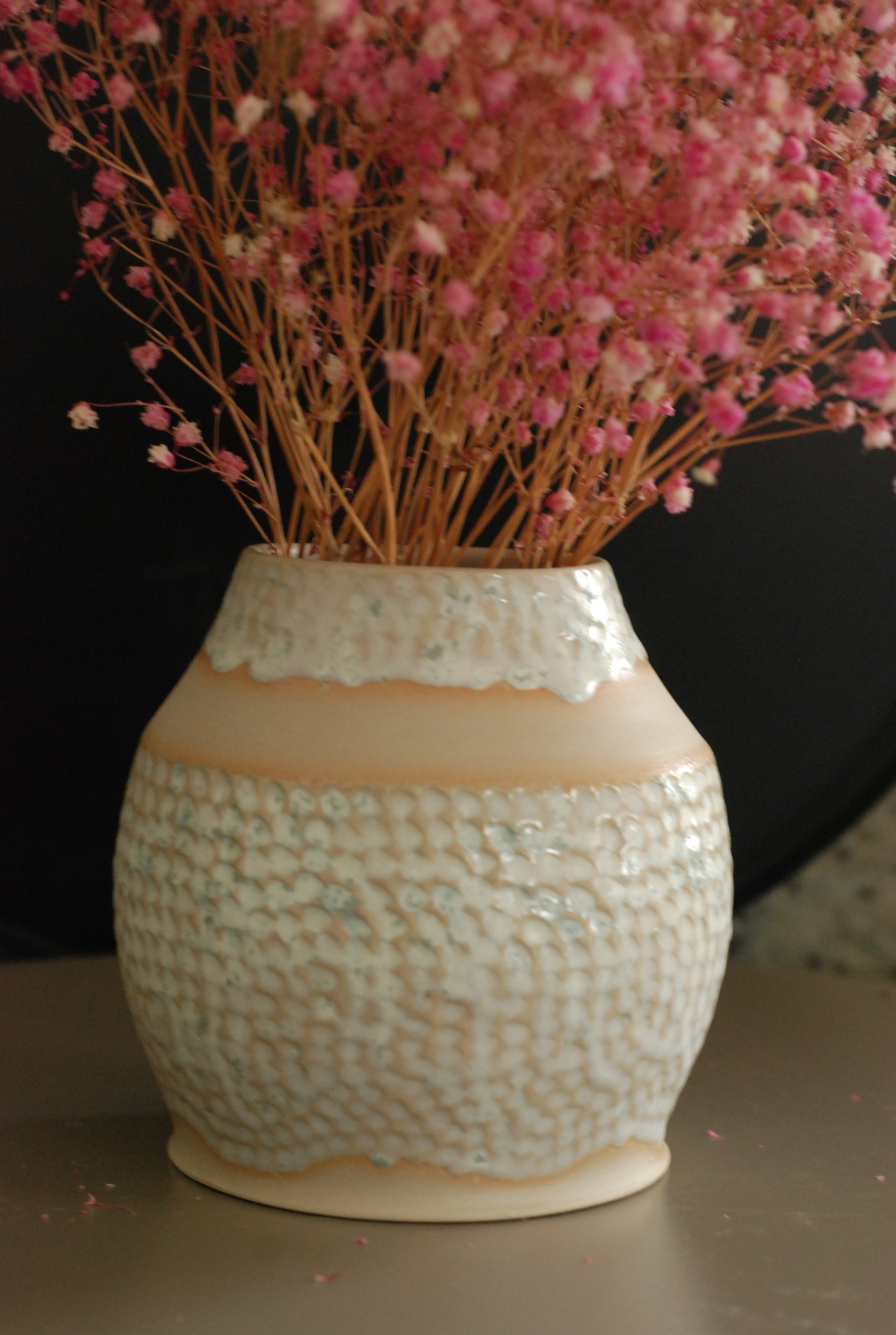 Niewielki wazon toczony na kole, z jasnej gliny. Szkliwiony efektowym szkliwem, z paskiem surowej gliny. Wazonik ma 14 cm, średnicę 10-13 cm.